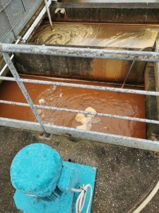 La 1ère étape est de mettre du chlorure ferrique pour que les saletés se posent au fond du bassin.